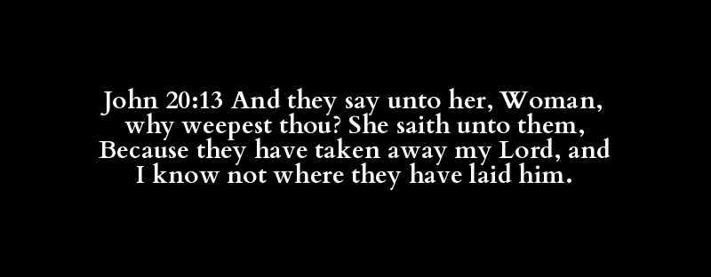 John 20:13 And they say unto her, Woman, why weepest thou? She saith unto them, Because they have taken away my Lord, and I know not where they have laid him.