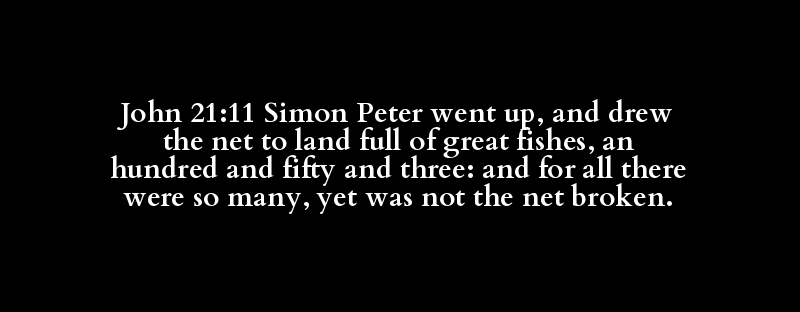 John 21:11 Simon Peter went up, and drew the net to land full of great fishes, an hundred and fifty and three: and for all there were so many, yet was not the net broken.