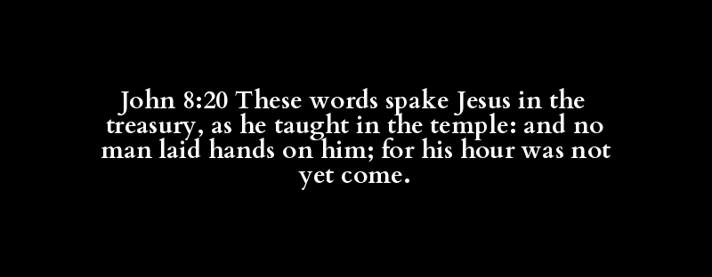 John 8:20 These words spake Jesus in the treasury, as he taught in the temple: and no man laid hands on him; for his hour was not yet come.
