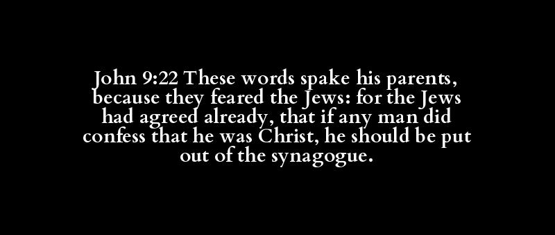 John 9:22 These words spake his parents, because they feared the Jews: for the Jews had agreed already, that if any man did confess that he was Christ, he should be put out of the synagogue.