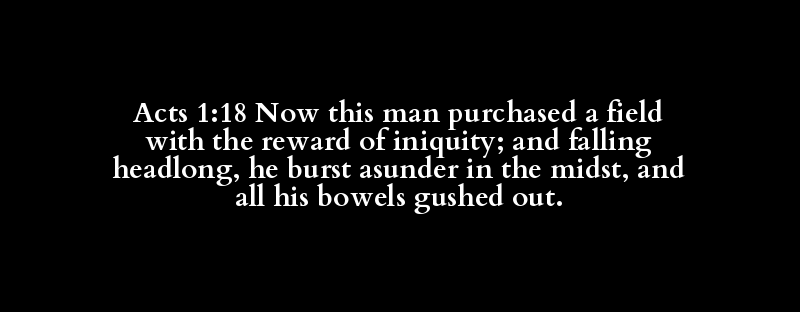 Acts 1:18 Now this man purchased a field with the reward of iniquity; and falling headlong, he burst asunder in the midst, and all his bowels gushed out.