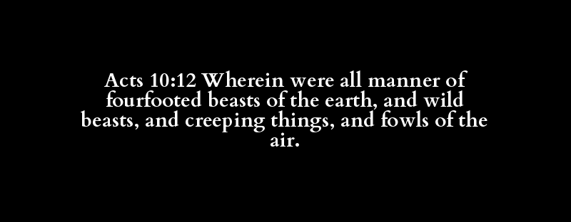Acts 10:12 Wherein were all manner of fourfooted beasts of the earth, and wild beasts, and creeping things, and fowls of the air.