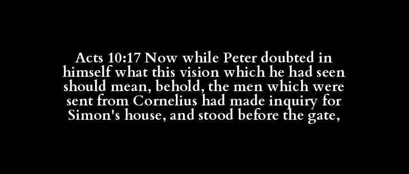 | also, and, but, moreover, now | about, after (that), (according) as (i.. | Peter, rock | be in) doubt, be (much) perplexed | about, after, against, + almost, X alt.. | alone, her (own, -self), (he) himself,.. | every man, how (much), + no(-ne, -thin.. | sight, vision | one, (an-, the) other, some, that, wha.. | be aware, behold, X can (+ not tell), .. | mean, + perish, should be, was, were | what-, where-, wither-, who-)soever | behold, lo, see | and, also, both, but, even, for, if, o.. | fellow, husband, man, sir | the, this, that, one, he, she, it, etc | put in, send (away, forth, out), set (.. | X here-)after, ago, at, because of, be.. | Cornelius | make enquiry for | Simon | home, house(-hold | assault, come (in, to, unto, upon), be.. | about (the times), above, after, again.. | gate, porch |