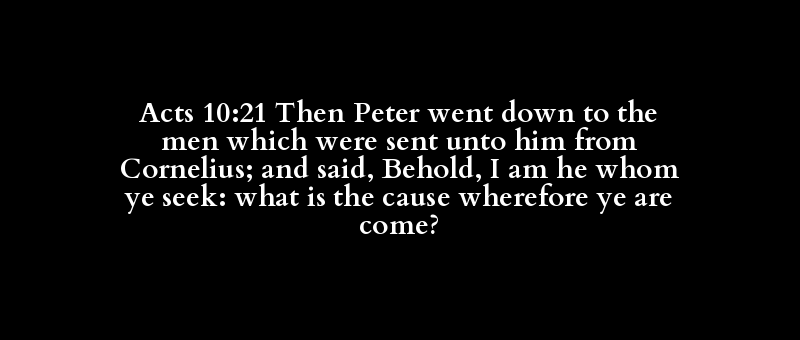 Acts 10:21 Then Peter went down to the men which were sent unto him from Cornelius; and said, Behold, I am he whom ye seek: what is the cause wherefore ye are come?