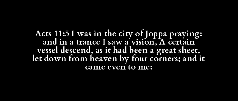 Acts 11:5 I was in the city of Joppa praying: and in a trance I saw a vision, A certain vessel descend, as it had been a great sheet, let down from heaven by four corners; and it came even to me: