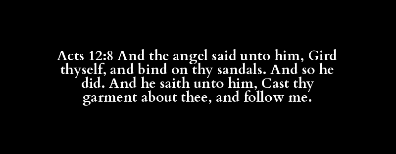 Acts 12:8 And the angel said unto him, Gird thyself, and bind on thy sandals. And so he did. And he saith unto him, Cast thy garment about thee, and follow me.