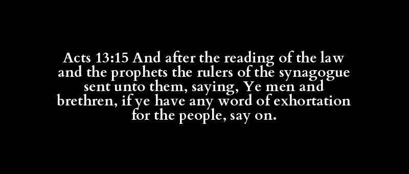 Acts 13:15 And after the reading of the law and the prophets the rulers of the synagogue sent unto them, saying, Ye men and brethren, if ye have any word of exhortation for the people, say on.