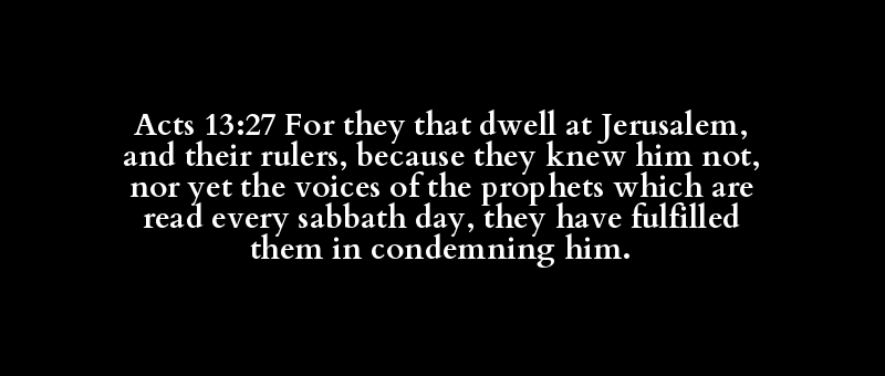 Acts 13:27 For they that dwell at Jerusalem, and their rulers, because they knew him not, nor yet the voices of the prophets which are read every sabbath day, they have fulfilled them in condemning him.