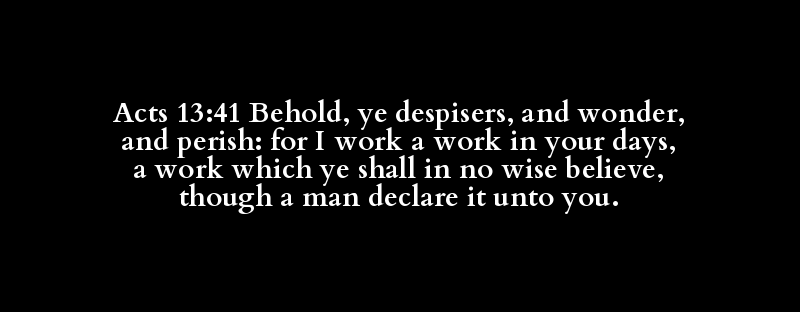 | εἴδω | καταφροντής | καί | θαυμάζω | καί | ἀφανίζω | ὅτι | ἐγώ | ἐργάζομαι | ἔργον | ἐν | ὑμῶν | ἡμέρα | ἔργον | ὅς | πιστεύω | οὐ μή | πιστεύω | ἐάν | τὶς | ἐκδιηγέομαι | ὑμῖν |