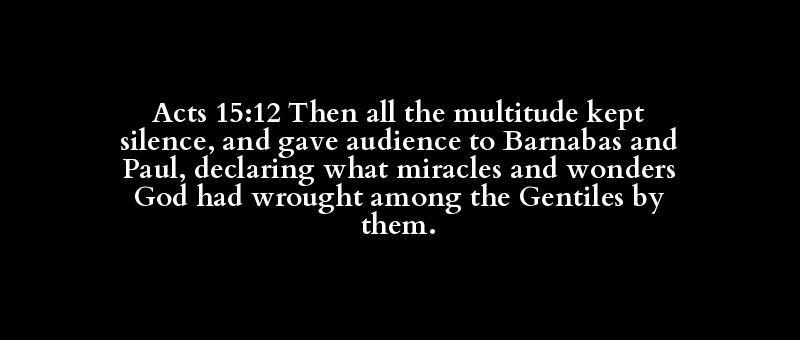 Acts 15:12 Then all the multitude kept silence, and gave audience to Barnabas and Paul, declaring what miracles and wonders God had wrought among the Gentiles by them.