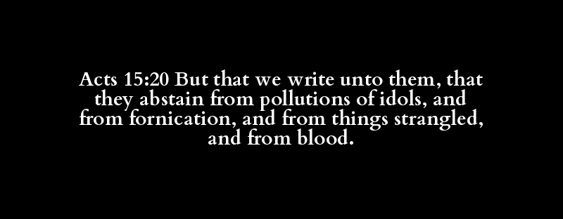 Acts 15:20 But that we write unto them, that they abstain from pollutions of idols, and from fornication, and from things strangled, and from blood.