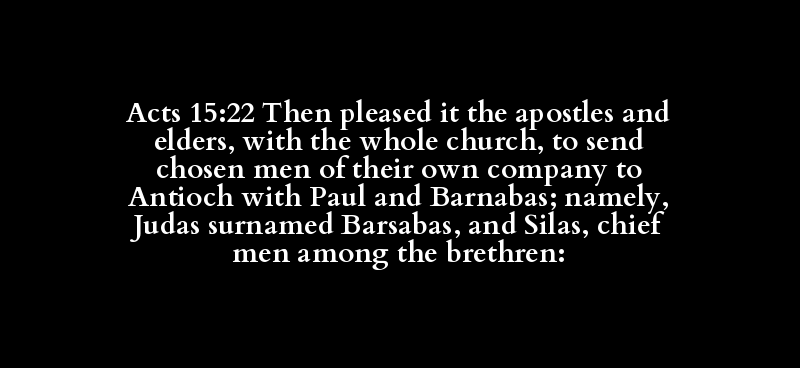 Acts 15:22 Then pleased it the apostles and elders, with the whole church, to send chosen men of their own company to Antioch with Paul and Barnabas; namely, Judas surnamed Barsabas, and Silas, chief men among the brethren: