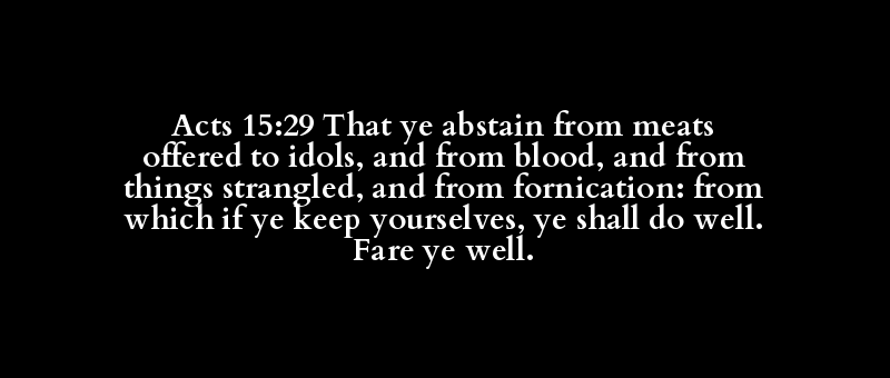 Acts 15:29 That ye abstain from meats offered to idols, and from blood, and from things strangled, and from fornication: from which if ye keep yourselves, ye shall do well. Fare ye well.