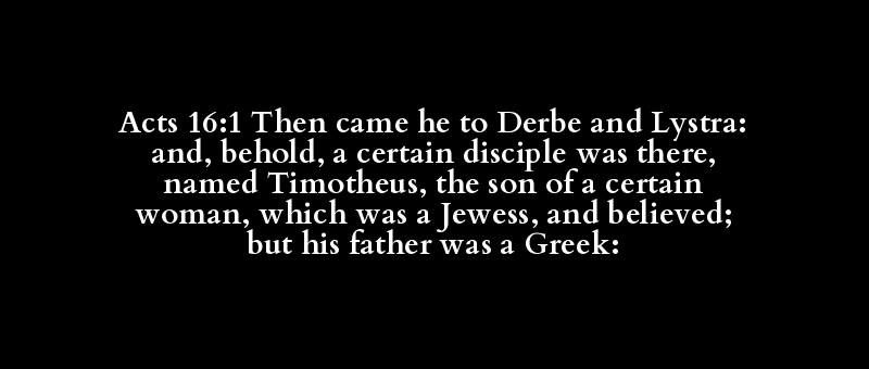Acts 16:1 Then came he to Derbe and Lystra: and, behold, a certain disciple was there, named Timotheus, the son of a certain woman, which was a Jewess, and believed; but his father was a Greek: