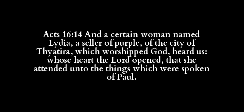 Acts 16:14 And a certain woman named Lydia, a seller of purple, of the city of Thyatira, which worshipped God, heard us: whose heart the Lord opened, that she attended unto the things which were spoken of Paul.