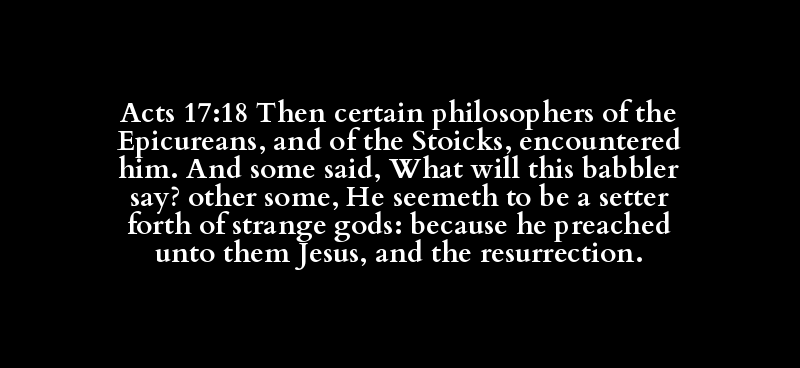 | [de] | [tis] | [philosophos] | [Epikoureios] | [kai] | [Stoikos] | [sumballo] | [autos] | [kai] | [tis] | [lego] | [tis] | [thelo] | [an] | [houtos] | [spermologos] | [lego] | [de] | [dokeo] | [einai] | [kataggeleus] | [xenos] | [daimonion] | [hoti] | [euaggelizo] | [autos] | [Iesous] | [kai] | [anastasis] |