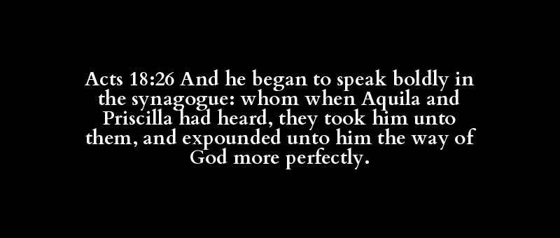 Acts 18:26 And he began to speak boldly in the synagogue: whom when Aquila and Priscilla had heard, they took him unto them, and expounded unto him the way of God more perfectly.