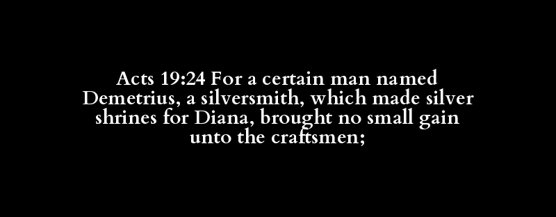 Acts 19:24 For a certain man named Demetrius, a silversmith, which made silver shrines for Diana, brought no small gain unto the craftsmen;