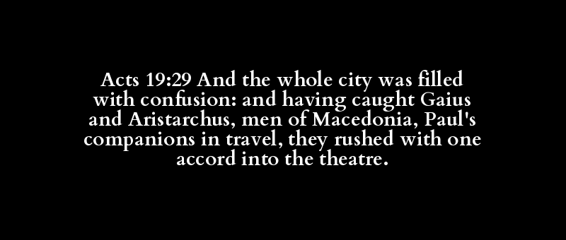 Acts 19:29 And the whole city was filled with confusion: and having caught Gaius and Aristarchus, men of Macedonia, Paul's companions in travel, they rushed with one accord into the theatre.