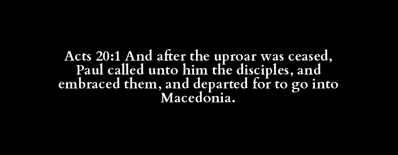 Acts 20:1 And after the uproar was ceased, Paul called unto him the disciples, and embraced them, and departed for to go into Macedonia.