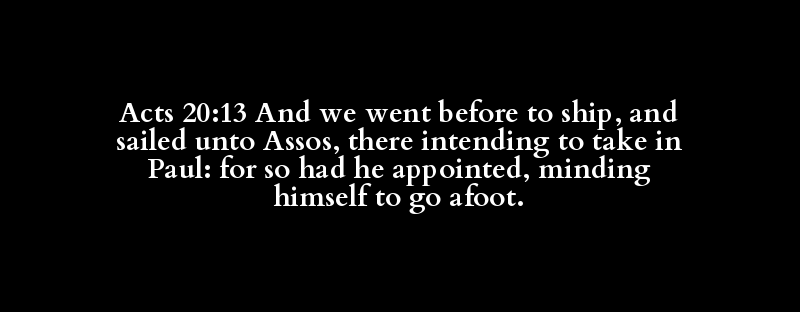 Acts 20:13 And we went before to ship, and sailed unto Assos, there intending to take in Paul: for so had he appointed, minding himself to go afoot.