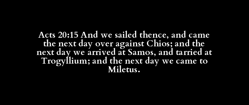 Acts 20:15 And we sailed thence, and came the next day over against Chios; and the next day we arrived at Samos, and tarried at Trogyllium; and the next day we came to Miletus.