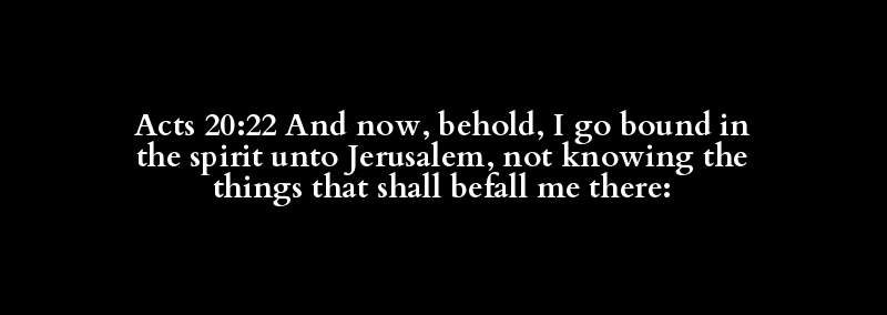 Acts 20:22 And now, behold, I go bound in the spirit unto Jerusalem, not knowing the things that shall befall me there: