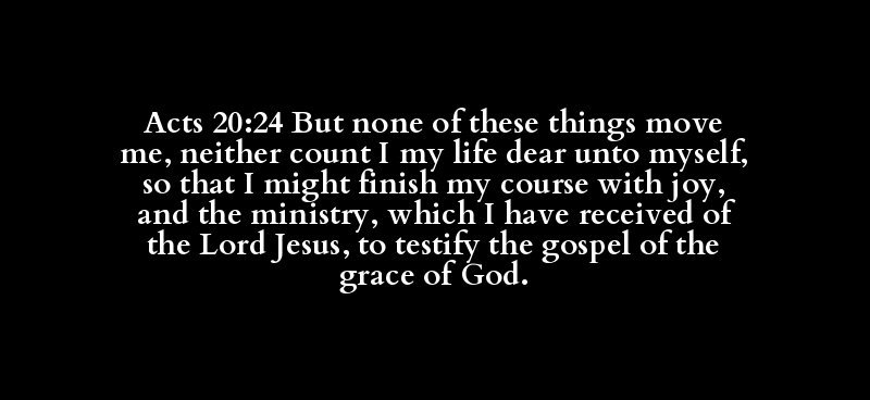 Acts 20:24 But none of these things move me, neither count I my life dear unto myself, so that I might finish my course with joy, and the ministry, which I have received of the Lord Jesus, to testify the gospel of the grace of God.