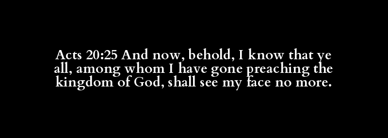 Acts 20:25 And now, behold, I know that ye all, among whom I have gone preaching the kingdom of God, shall see my face no more.