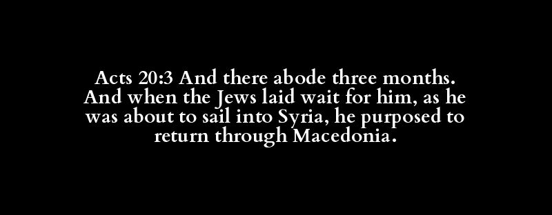 Acts 20:3 And there abode three months. And when the Jews laid wait for him, as he was about to sail into Syria, he purposed to return through Macedonia.