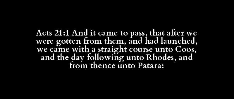 Acts 21:1 And it came to pass, that after we were gotten from them, and had launched, we came with a straight course unto Coos, and the day following unto Rhodes, and from thence unto Patara: