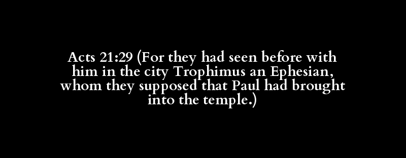 Acts 21:29 (For they had seen before with him in the city Trophimus an Ephesian, whom they supposed that Paul had brought into the temple.)