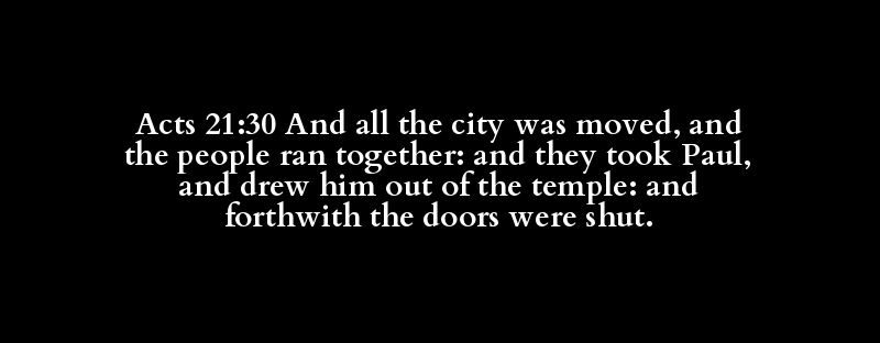 Acts 21:30 And all the city was moved, and the people ran together: and they took Paul, and drew him out of the temple: and forthwith the doors were shut.