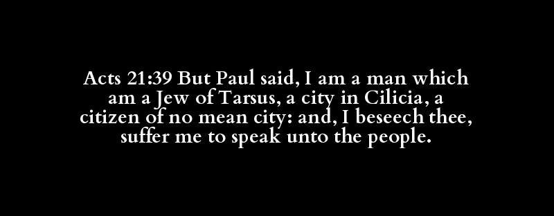 Acts 21:39 But Paul said, I am a man which am a Jew of Tarsus, a city in Cilicia, a citizen of no mean city: and, I beseech thee, suffer me to speak unto the people.
