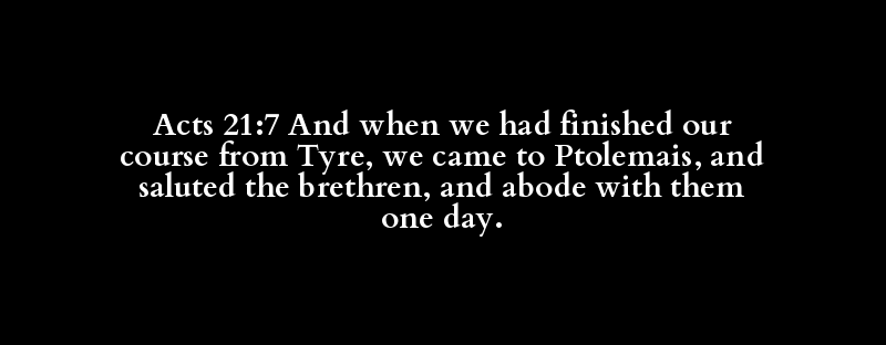 Acts 21:7 And when we had finished our course from Tyre, we came to Ptolemais, and saluted the brethren, and abode with them one day.