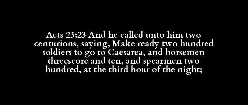 Acts 23:23 And he called unto him two centurions, saying, Make ready two hundred soldiers to go to Caesarea, and horsemen threescore and ten, and spearmen two hundred, at the third hour of the night;