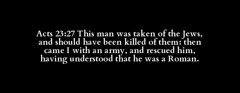 Acts 23:27 This man was taken of the Jews, and should have been killed of them: then came I with an army, and rescued him, having understood that he was a Roman.