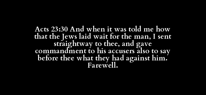 Acts 23:30 And when it was told me how that the Jews laid wait for the man, I sent straightway to thee, and gave commandment to his accusers also to say before thee what they had against him. Farewell.