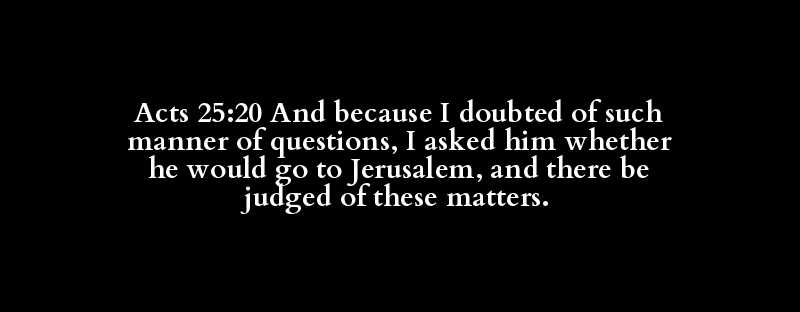 Acts 25:20 And because I doubted of such manner of questions, I asked him whether he would go to Jerusalem, and there be judged of these matters.