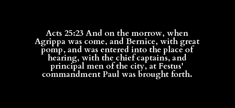 Acts 25:23 And on the morrow, when Agrippa was come, and Bernice, with great pomp, and was entered into the place of hearing, with the chief captains, and principal men of the city, at Festus' commandment Paul was brought forth.