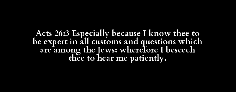 Acts 26:3 Especially because I know thee to be expert in all customs and questions which are among the Jews: wherefore I beseech thee to hear me patiently.