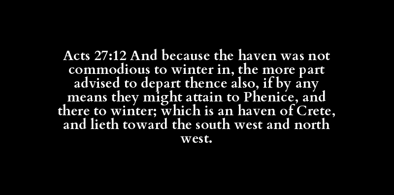 Acts 27:12 And because the haven was not commodious to winter in, the more part advised to depart thence also, if by any means they might attain to Phenice, and there to winter; which is an haven of Crete, and lieth toward the south west and north west.