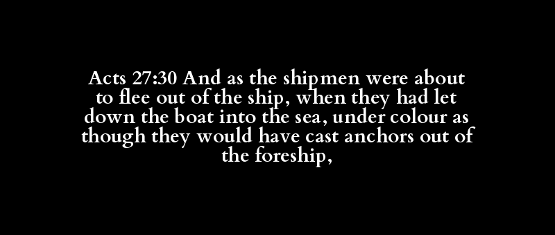 Acts 27:30 And as the shipmen were about to flee out of the ship, when they had let down the boat into the sea, under colour as though they would have cast anchors out of the foreship,