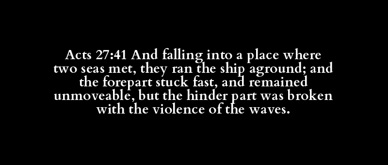 Acts 27:41 And falling into a place where two seas met, they ran the ship aground; and the forepart stuck fast, and remained unmoveable, but the hinder part was broken with the violence of the waves.