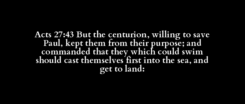 Acts 27:43 But the centurion, willing to save Paul, kept them from their purpose; and commanded that they which could swim should cast themselves first into the sea, and get to land: