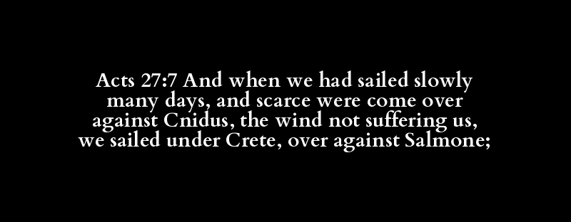 Acts 27:7 And when we had sailed slowly many days, and scarce were come over against Cnidus, the wind not suffering us, we sailed under Crete, over against Salmone;