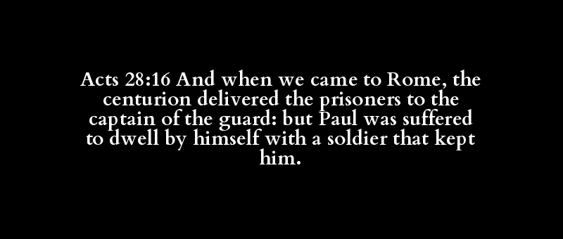 Acts 28:16 And when we came to Rome, the centurion delivered the prisoners to the captain of the guard: but Paul was suffered to dwell by himself with a soldier that kept him.