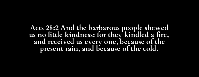 | δέ | βάρβαρος | παρέχω | ἡμῖν | οὐ | τυγχάνω | φιλανθρωπία | γάρ | ἀνάπτω | πυρά | προσλαμβάνω | ἡμᾶς | πᾶς | διά | ἐφίστημι | ὑετός | καί | διά | ψύχος |