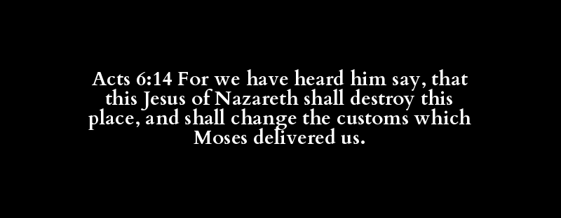 | [gar] | [akouo] | [autos] | [lego] | [hoti] | [touton] | [Iesous] | [Nazoraios] | [kataluo] | [houtos] | [topos] | [kai] | [allasso] | [ethos] | [hos] | [Moseus] | [paradidomi] | [hemin] |