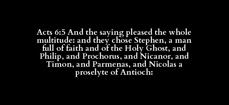 | [kai] | [logos] | [aresko] | [enopion] | [pas] | [plethos] | [kai] | [eklegomai] | [Stephanos] | [aner] | [pleres] | [pistis] | [kai] | [hagios] | [pneuma] | [kai] | [Philippos] | [kai] | [Prochoros] | [kai] | [Nikanor] | [kai] | [Timon] | [kai] | [Parmenas] | [kai] | [Nikolaos] | [proselutos] | [Antiocheus] |